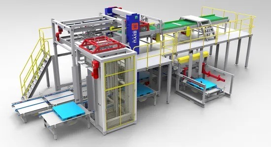 This system is designed specifically for the efficient palletizing and depalletizing of full cans. It consists of a full cans palletizer, depalletizer, and a reliable full cans conveyor system. The lifting mechanism of this system is powered by hydraulic drive, ensuring smooth and precise movements. The cans are securely clamped and shifted in a parallel motion using a synchronous belt drive.